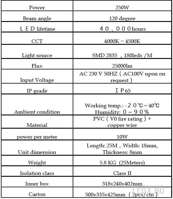 Styrke: 250W (10W / meter)